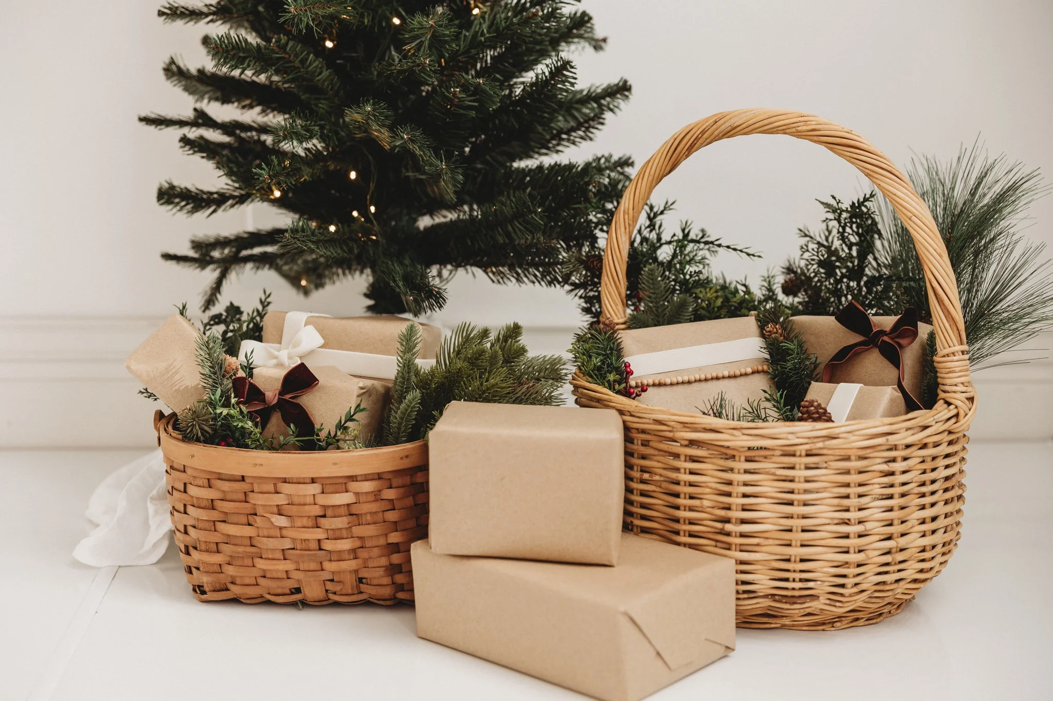 Lighted arch • Wicker baskets with greenery + presents • 2 rocking horse options • can be styled in many ways