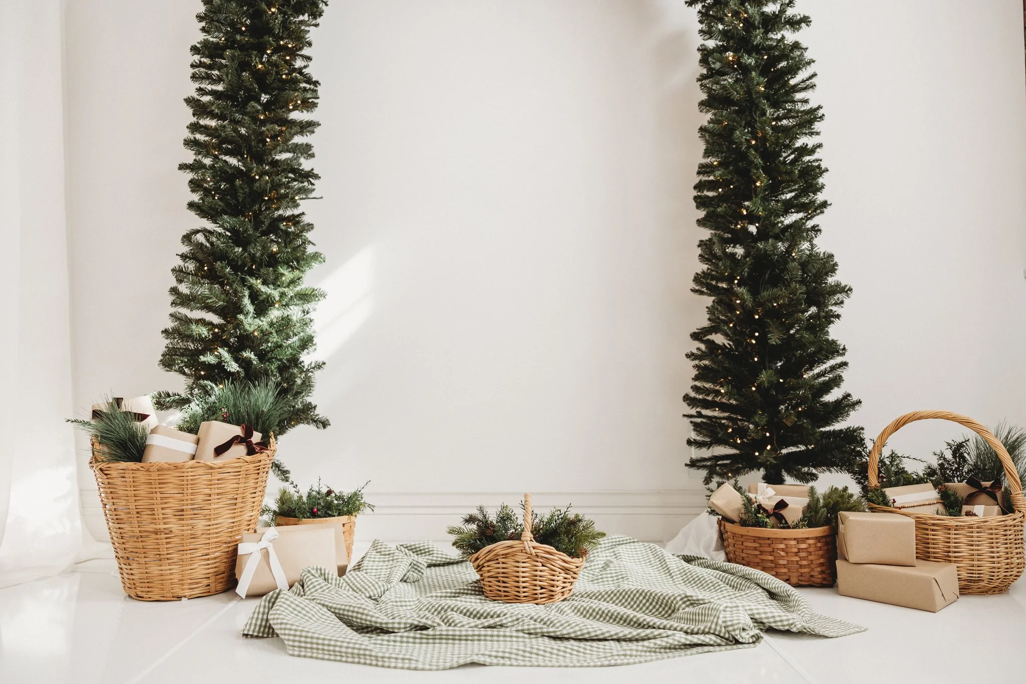 Fully decorated tree with white presents • Curtain backdrop with draping • Small couch • Green couch styled with Christmas decor + gingham pillows